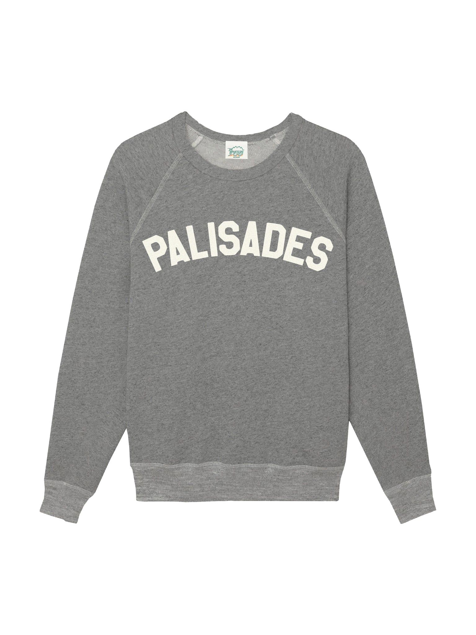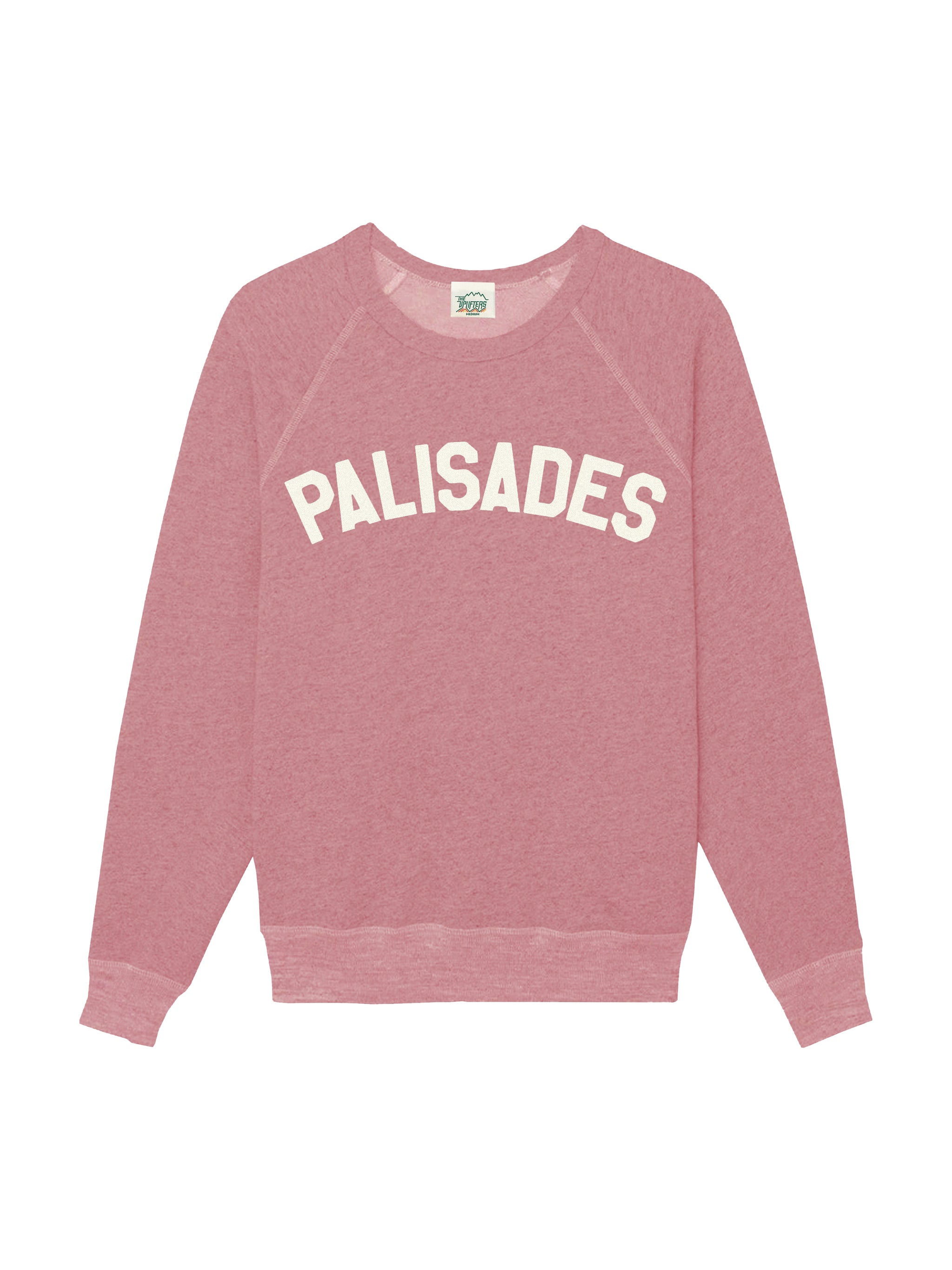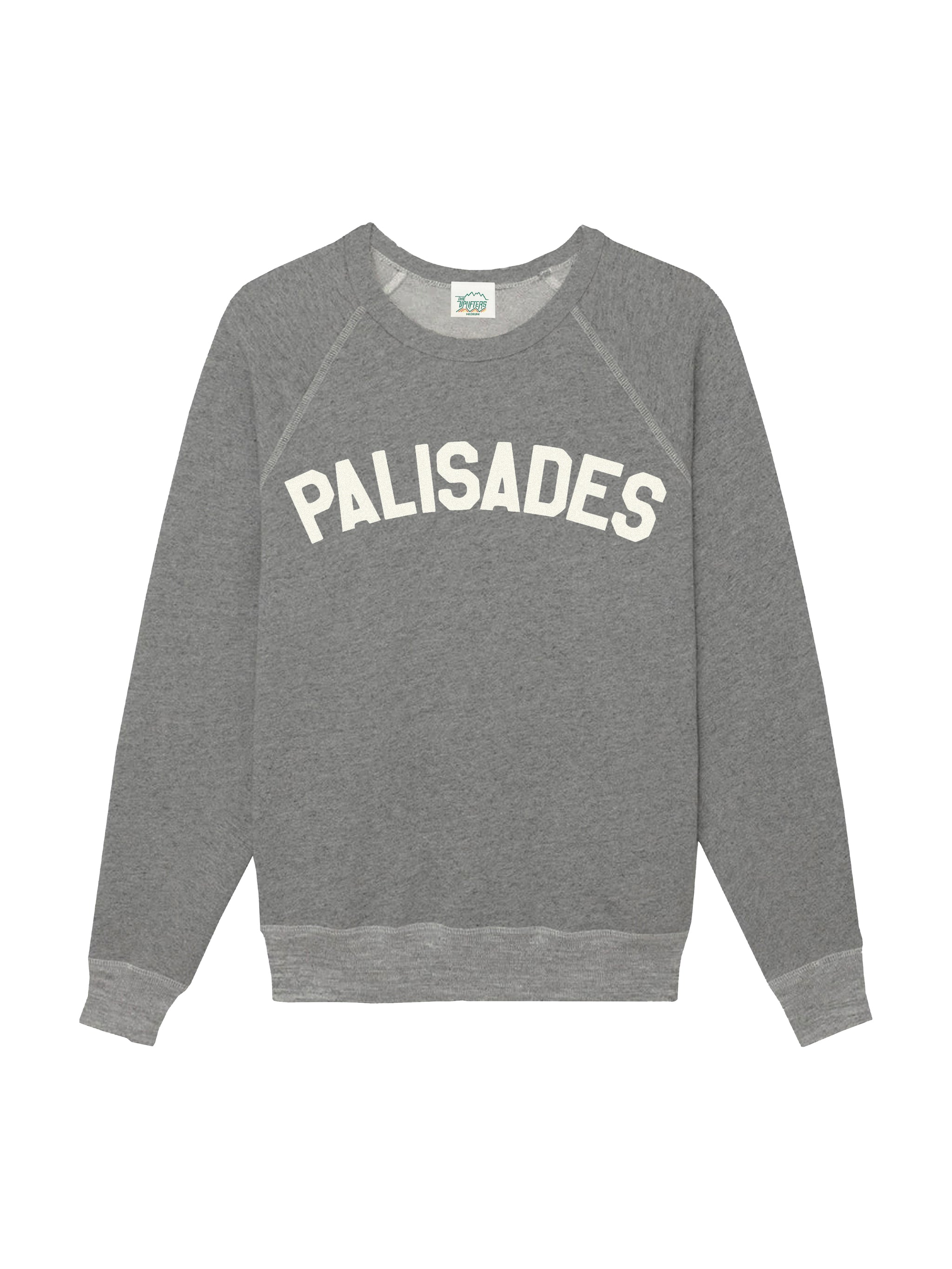 The signature Jetty sweatshirt, Super soft blended cotton and relaxed raglan sleeve. Textured flock printed in block print Palisades. An Uplifters classic.
